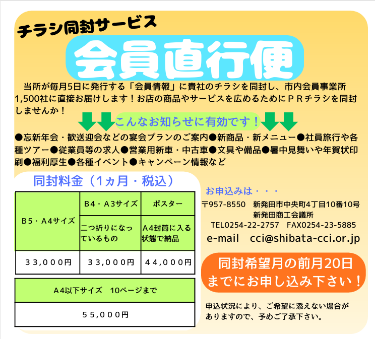 当所が毎月5日に発行する「会員情報」に貴社のチラシを同封し、市内会員事業所1,500社に直接お届けします!お店や企業の商品・サービスを広めるために、新たな販路の開拓のツールとしてぜひお使いください。