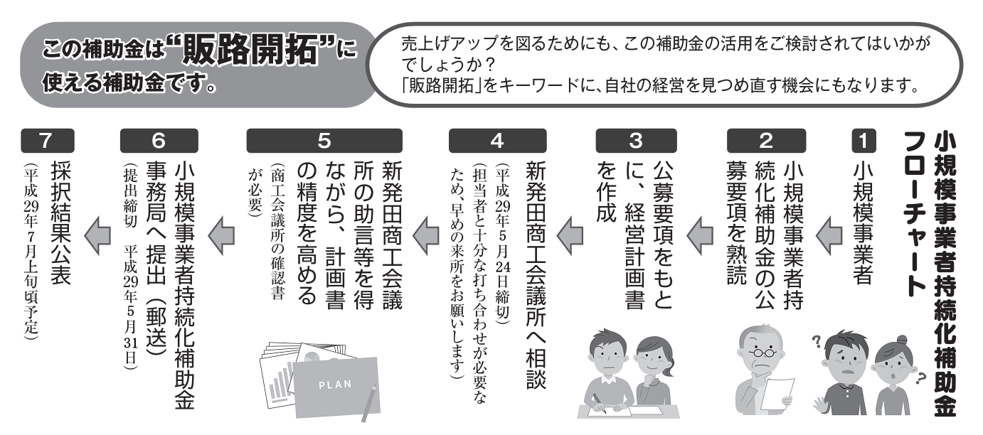 本事業は、小規模事業者の事業の持続的発展を後押しするため、小規模事業者が、商工会・商工会議所の支援を受けて経営計画を作成し、その計画に沿って取り組む販路開拓等を支援するものです。